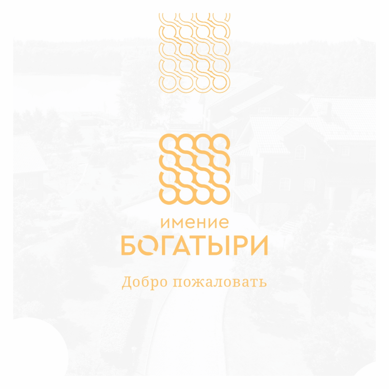 Для имения «Богатыри» мы подобрали лаконичный, в меру округлый шрифт, который поддерживает идею спокойной домашней атмосферы. Кроме того он не «спорит» с другими деталями и не перегружает визуал.